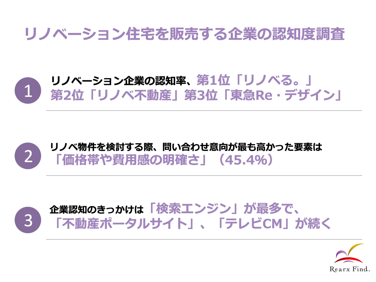 株式会社リアークスファインドは、リノベーション住宅を提供する企業に関する認知度調査を実施しました。対象は、一都三県に住む世帯年収500万円以上の30代から50代の方々を500名選定し、デジタルな手法で調査を行いました。