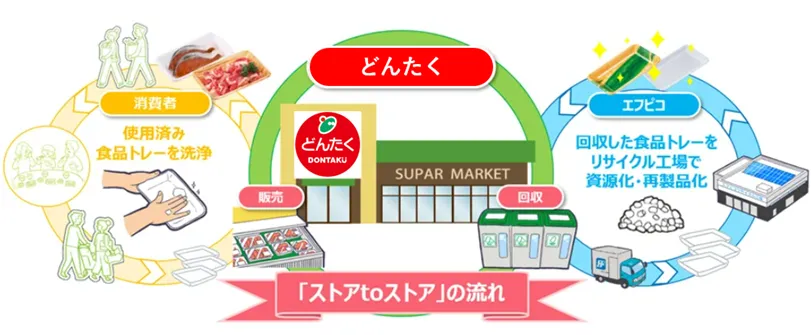 この取り組みの核心は、「ストアtoストア」と呼ばれる水平リサイクルです。どんたくの店舗では、地域の協力を得て、使用済みの食品トレーや透明容器を回収するボックスが設置されています。これらの資源は、すべてエフピコによって再利用され、エコ製品として新たに食品トレーや透明容器として生まれ変わります。このプロセスにより、どんたくの売り場で再利用されることで、さらに多くの資源が循環します。
