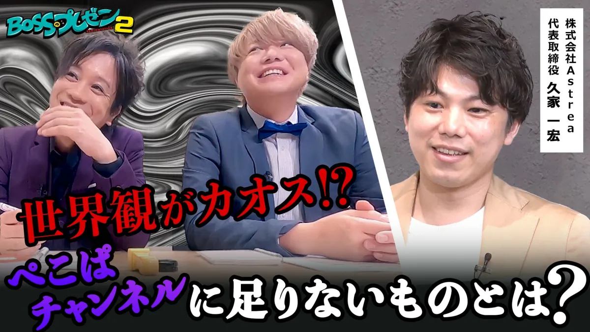 「BOSSのプレゼン」は、企業が直面するさまざまな課題に対して斬新な視点を提供するためのプラットフォーム。MCを務めるぺこぱ(松陰寺太勇・シュウペイ)と共に、ゲストとして出演した久家氏は、独自の「心理×戦略」アプローチを駆使し、ぺこぱ自身のYouTubeチャンネルの運営方法について深掘りしました。