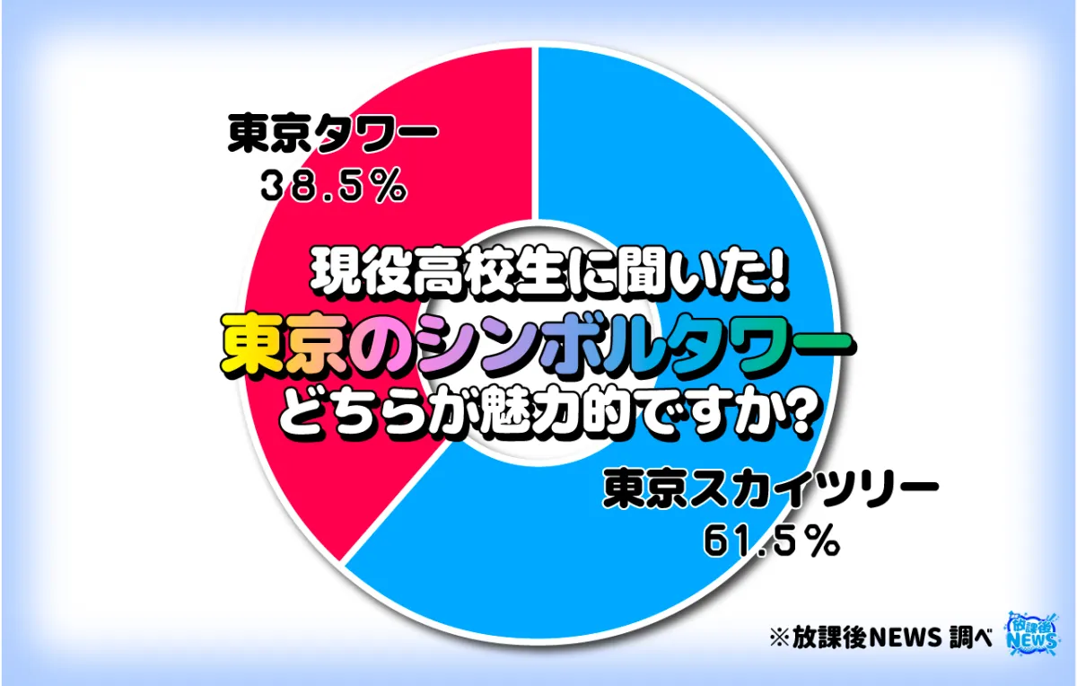 この調査は、全国の高校生218名を対象に行われました(調査期間:2025年6月2日〜16日)。結果は、圧倒的に61.5%の高校生が「東京スカイツリー」を選びました。