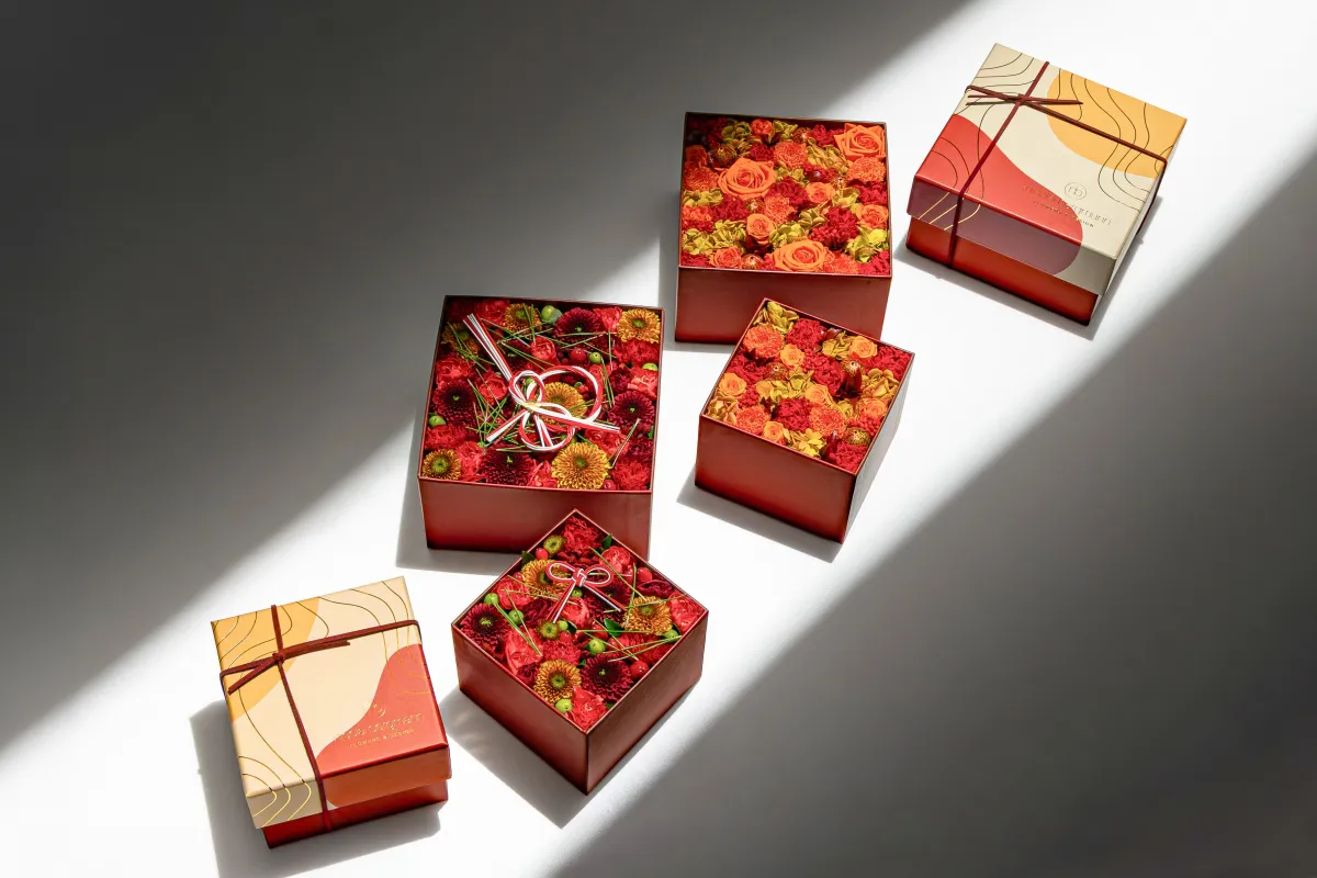 このボックスは、黄金色のラインが優雅に流れるデザインで、鮮やかな朱赤の色合いが新年の訪れを楽しませてくれます。開けると広がる色とりどりのフラワーデザインは、見る人を魅了し、暖かい雰囲気を演出します。フレッシュフラワー及びプリザーブドフラワーが用意されており、年末年始のギフトや新年の挨拶にぴったりのアイテムです。