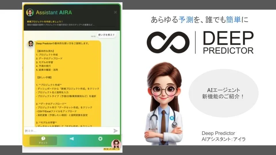 『Deep Predictor』は、専門的なAI知識を持たない担当者でも、簡単に予測分析を行えるように設計されていますが、AIRAの登場によりその使いやすさが一層向上します。具体的には、以下のような機能を持っています: