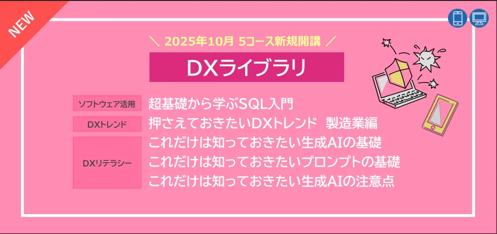 株式会社日本能率協会マネジメントセンター(JMAM)は、法人向け教育ツール「eラーニングライブラリ®」を通じて、2025年10月から新たに5つのコースを開講します。これらのコースは、デジタル変革(DX)を実現するために必要な基礎知識を学ぶ良い機会です。