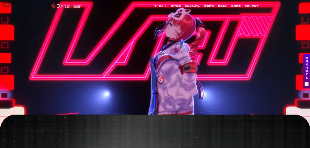 サービスページでは、デジタルギアが提供する「VTuber制作・運用支援」と「デジタルラボスタジオ」に焦点を当てています。VTuber制作を通じて、キャラクターのデザインや3Dモデリング、配信時の演出までをトータルサポート。また、モーションキャプチャースタジオを設け、動きを通じて品質を検証できる環境を提供しています。