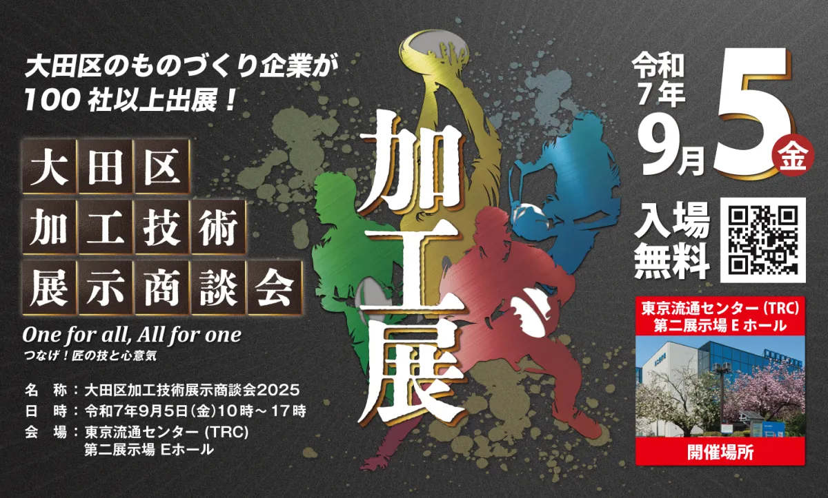 2025年9月5日(金)、東京流通センター第二展示場Eホールにて「大田区加工技術展示商談会2025」が開催されます。この展示会は、東京23区内において最も多くの製造業が集まる大田区が誇るイベントであり、毎年多くの企業が参加しています。大田区には3,500以上の製造業が存在しており、その多くは高度な加工技術を有している企業です。これらの企業が一堂に会し、普段は接触することが難しい特別な製品やサービスを紹介します。