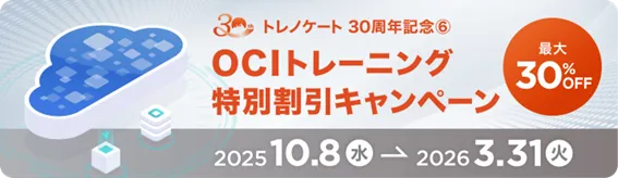 トレノケート株式会社が設立30周年を迎えるのを記念して、Oracle Cloud Infrastructure(OCI)に関するトレーニングを期間限定で特別割引価格で提供するキャンペーンを実施中です。この機会に、クラウドスキルを強化し、マルチクラウド人材としてのキャリアを加速させるチャンスをお見逃しなく!