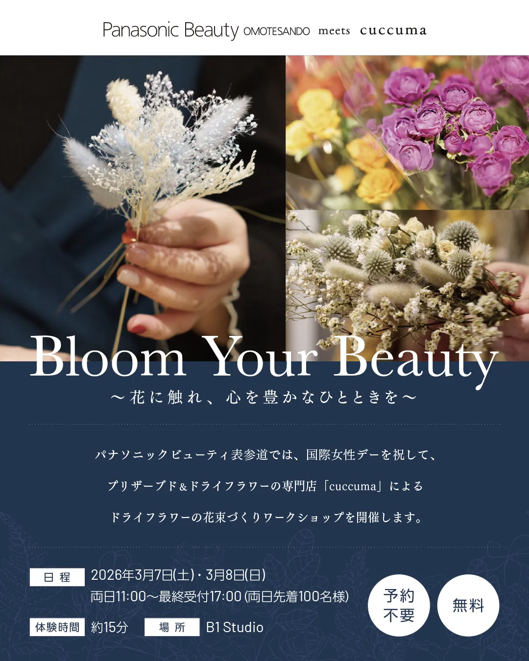「パナソニックビューティ表参道」は、東京都渋谷区神宮前4丁目に位置し、営業時間は11:00から19:00まで。定休日は毎月第2または第3月曜日となっております。春の訪れとともに、心と身体の美を追求するためのイベントをぜひお見逃しなく!