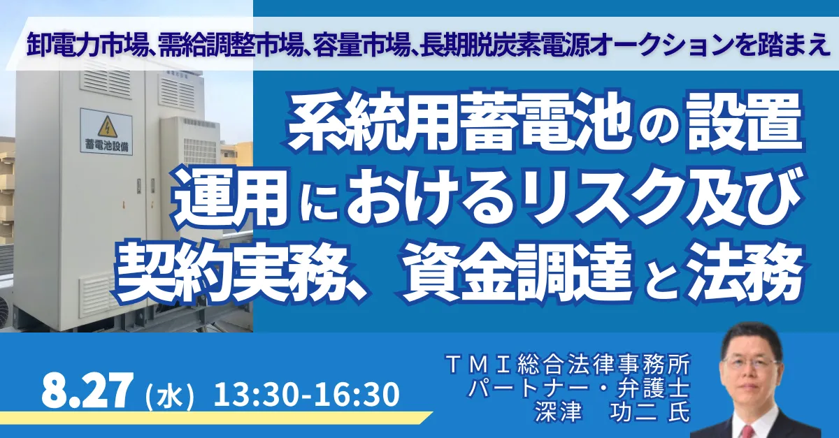 このセミナーを通じて、参加者は系統用蓄電池の運用に関する具体的な知識を得ることができます。特に、法律や契約に関する専門家の視点を直接聞くことができるため、自社のリスク管理や資金調達戦略を見直す良い機会となるでしょう。