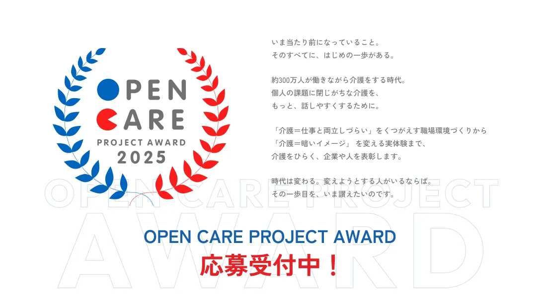 経済産業省が主催する「OPEN CARE PROJECT AWARD 2025」が開催されます。このプロジェクトは、個人の課題とされてきた介護を、皆で話し合う話題に変えることを目的としています。介護に関わる様々な取組を表彰し、その輪を広げることで、より多くの人に介護が身近な存在であることを知ってもらうことを目指しています。