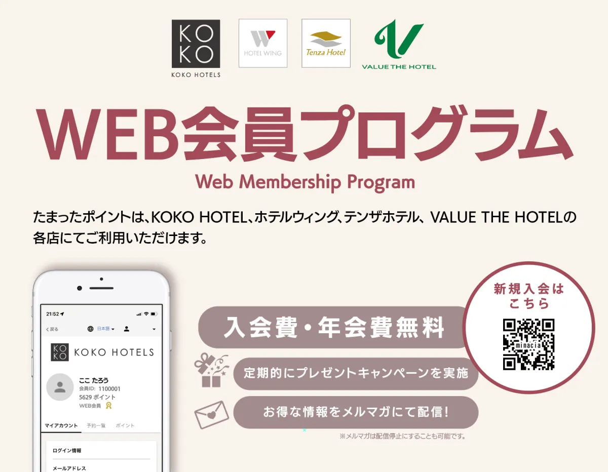 また、貯まったポイントはKOKO HOTELだけでなく、グループホテルのHOTEL WINGやTENZA HOTELでも利用できるため、さまざまな宿泊先での利用が可能です。