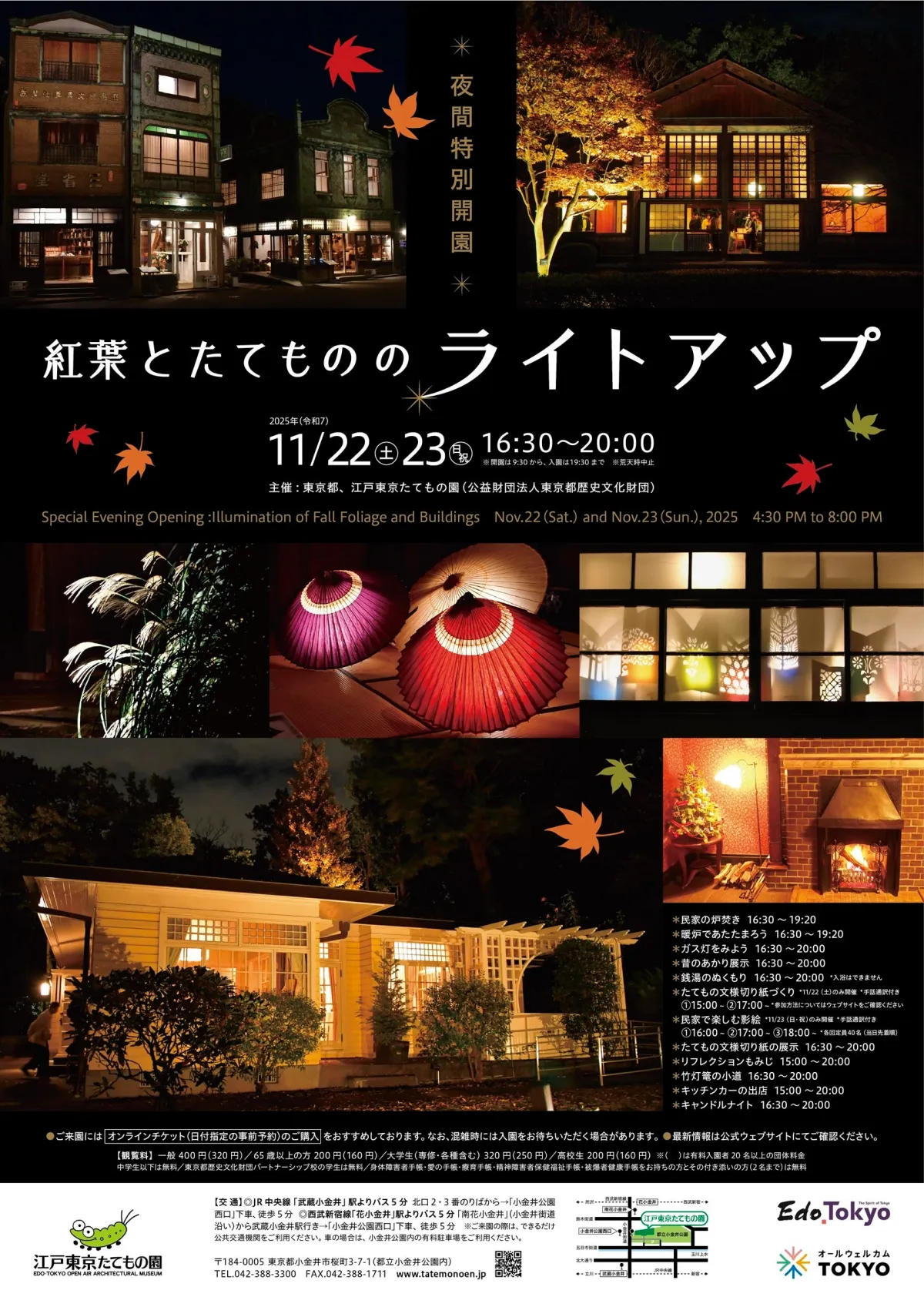 本イベントは、16:30から20:00まで延長され、特に色づき始めた紅葉と共に、園内の歴史的建物があたたかな光に包まれます。開園は午前9:30から、入園は19:30までですが、特に夕方からの訪問をおすすめします。