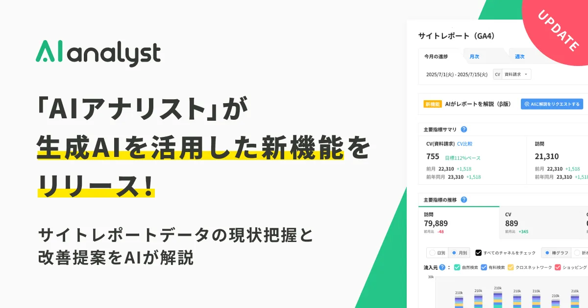 サイトレポートというのは、特定のWebサイトにおけるさまざまな指標を監視するための分析機能です。例えば、ページビュー、コンバージョン率などの重要な数値を定期的にまとめ、ダッシュボードのように視覚化する役割を担っています。月単位、週単位でのデータを集計することで、Webサイトの健康状態や変化を明確に把握できるのです。これまでこの情報を元にした施策の立案には、多くの労力がかかっていました。