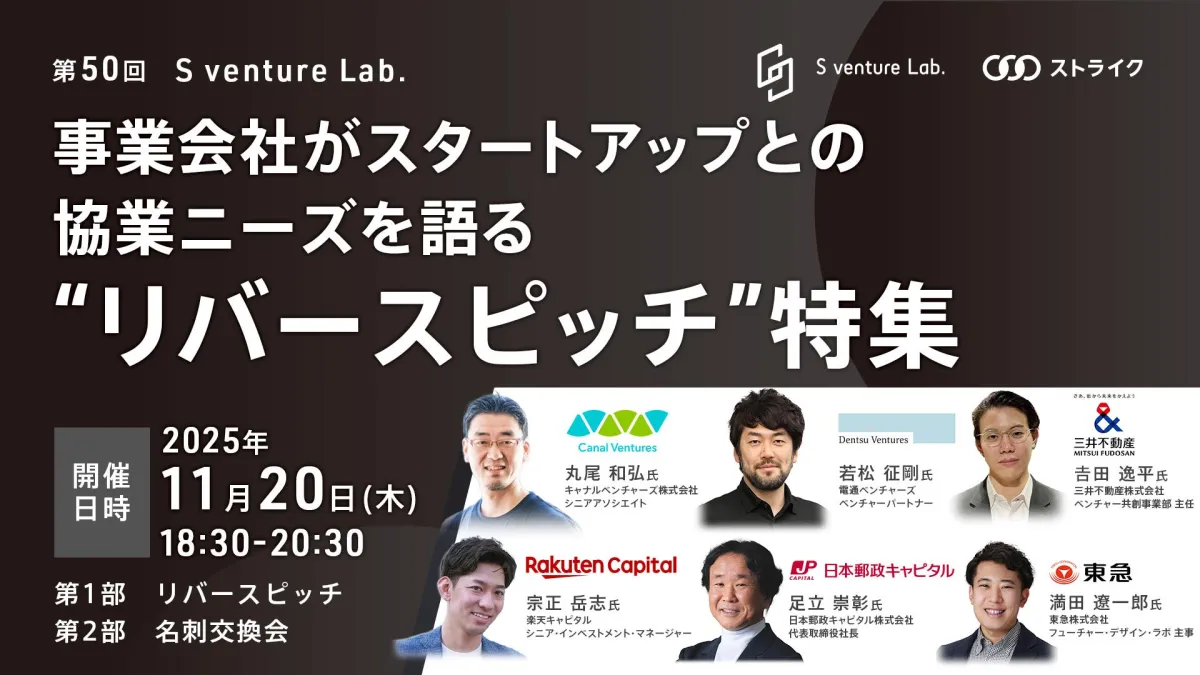 2025年11月20日、東京都港区に位置するTHE MUSEUMにて、株式会社ストライクが主催する特別なイベント『S venture Lab.』が開催されます。今回で50回目を迎えるこのイベントは、事業会社がスタートアップとの協業ニーズを発信するリバースピッチ特集をテーマにしています。