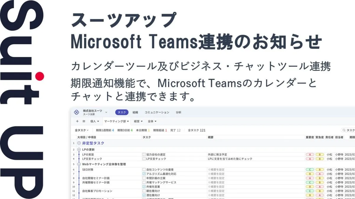 最近、株式会社スーツが手掛けるAIタスク管理・プロジェクト管理ツール「スーツアップ」が大きな進化を遂げました。新たに搭載されたMicrosoft Teamsとの連携機能によって、タスク管理が今まで以上にスムーズに行えるようになったのです。この連携により、タスクの期限通知やコミュニケーションが一元化され、業務の効率化が図れるようになります。