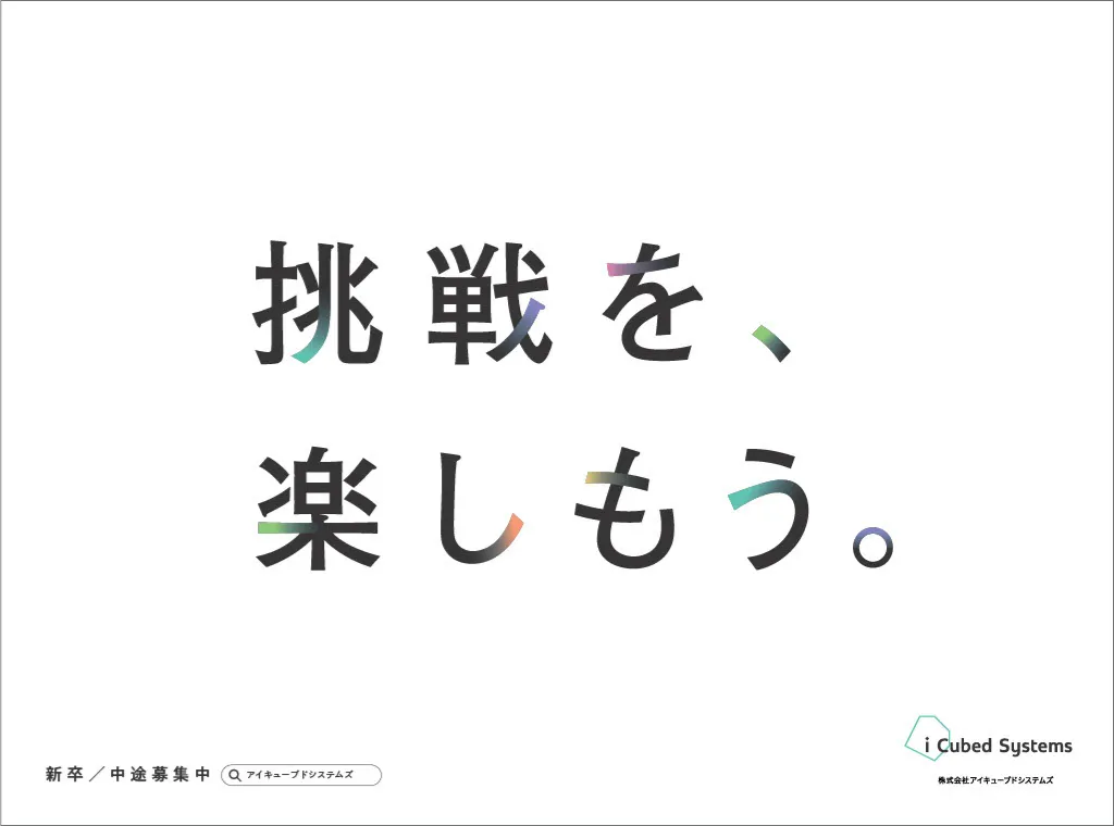最近発表された広告では、同社のブランドスローガン「挑戦を、楽しもう。」が中心に据えられています。このスローガンは、企業が掲げる価値観をシンプルに表現しており、挑戦することの楽しさをアピールすることに重きを置いています。広告デザインには、アイキューブドシステムズの独自性や企業としての姿勢が反映されており、見る人に強い影響を与えることを期待しています。
