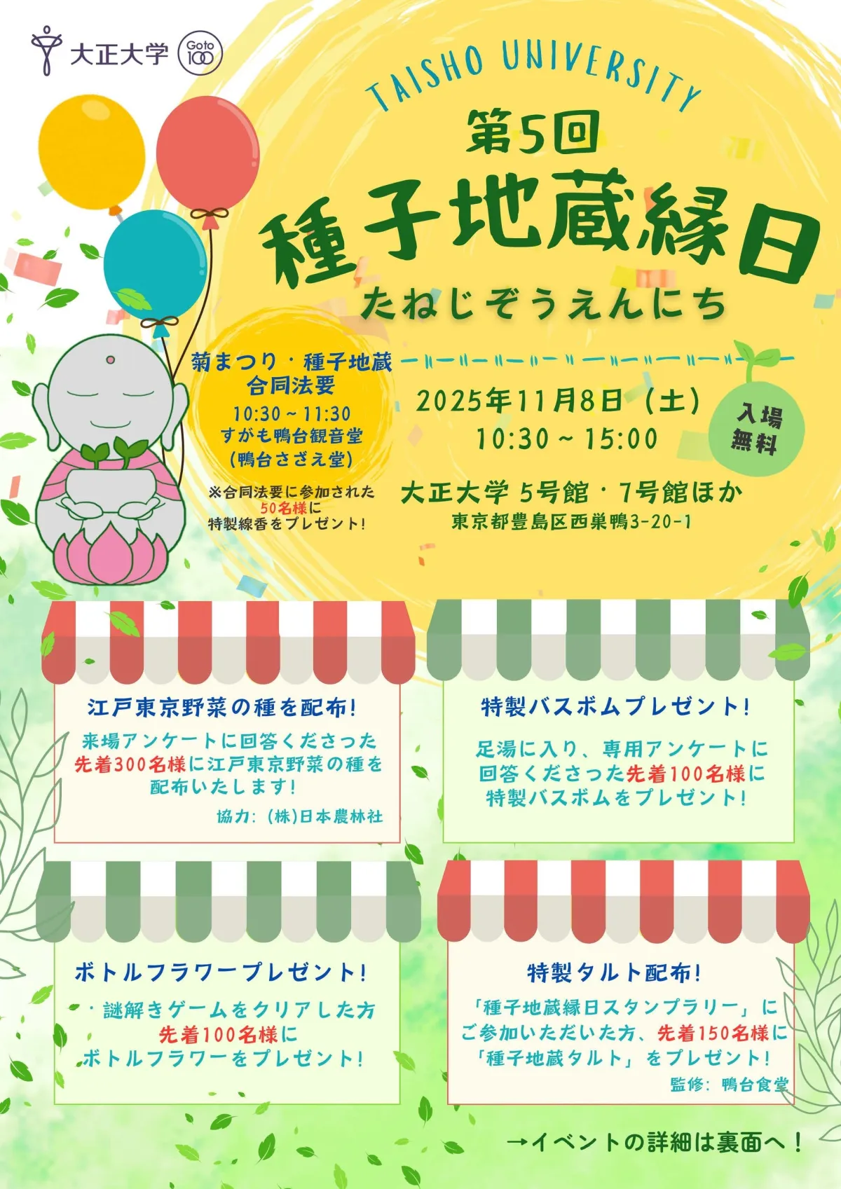 大正大学(学長:神達知純)は、2025年11月8日(土)に『第5回種子地蔵縁日』を開催することを発表しました。本イベントは、同大学が位置する巣鴨地域の歴史と文化を紹介し、地域社会との絆を深めることを目指しています。