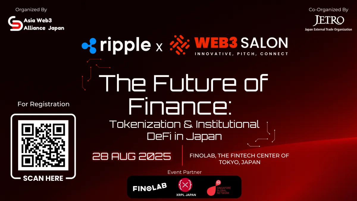2025年8月20日、東京で特別なサイドイベントが開催されます。それはRippleとWeb3サロンが共に企画し、AWAJ(Asia Web3 Alliance Japan)が主催、JETRO(日本貿易振興機構)が共催、さらにFINOLAB Tokyoとシンガポール経済開発庁(EDB Singapore)のパートナーシップのもと行われる「金融の未来」というタイトルのイベントです。