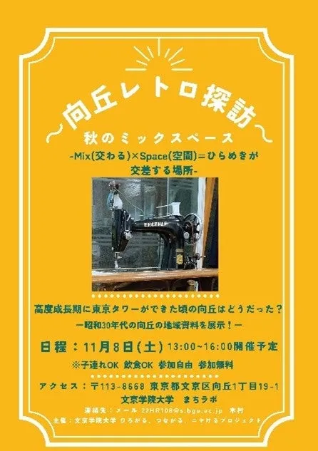 文京学院大学人間学部の4年生によるユニークな試み、「向丘レトロ探訪 秋のミックスペース」が2025年11月8日に開かれることになりました。このイベントは、地域の歴史を今に伝え、さまざまな世代が交流する機会を提供するものです。会場は、文京区向丘町にあるまちづくり研究センター、通称「まちラボ本郷」。