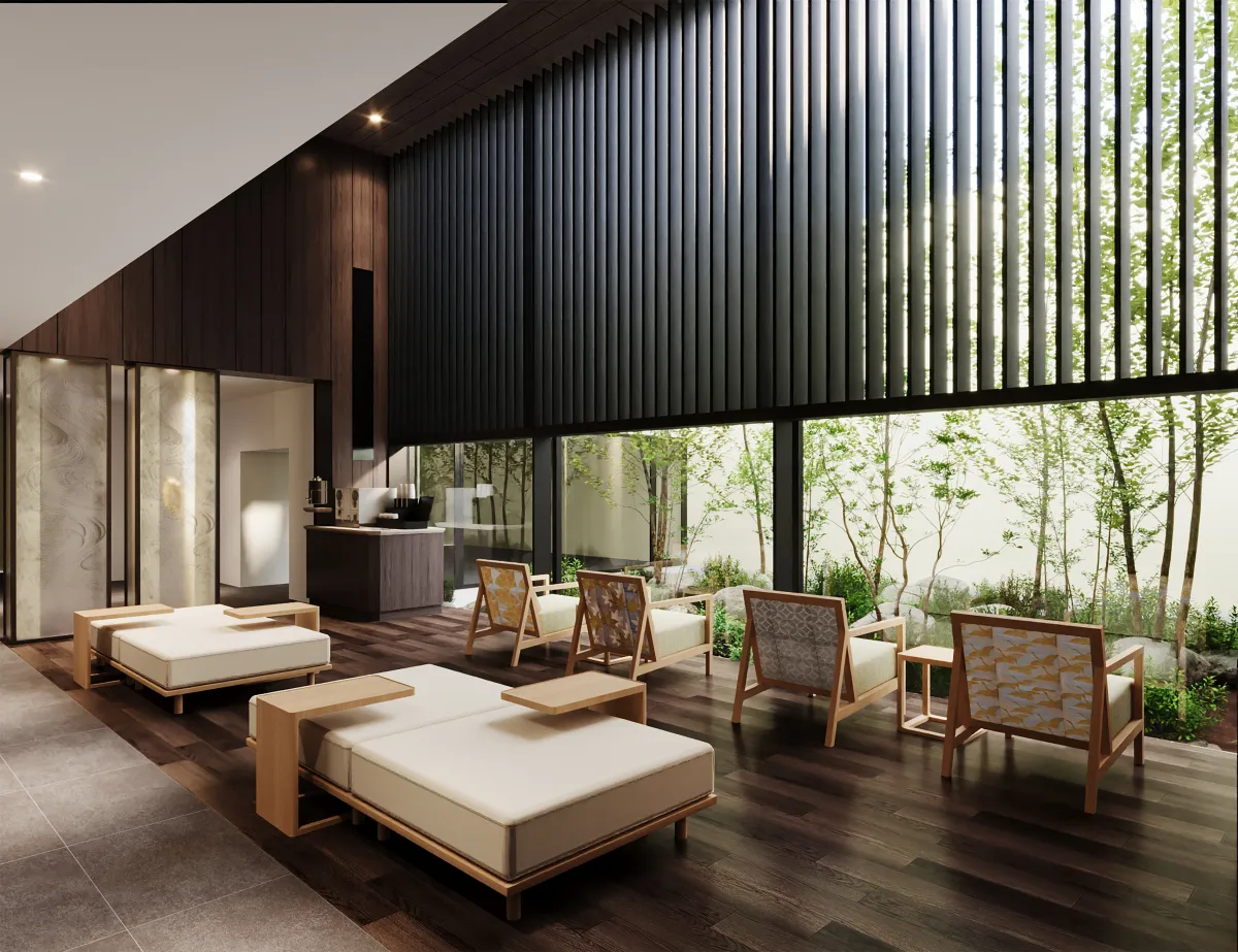 特に、ロビーラウンジではかつての呉服商にちなんだギャラリースペースも新設され、訪れる人々に歴史を感じさせる仕掛けが施されています。大きな窓からは美しい庭の景色が広がり、居心地の良いソファでリラックスすることができます。さらに、フリードリンクサービスではコーヒーマシンやデトックスウォーターを用意し、より快適な時間を提供します。
