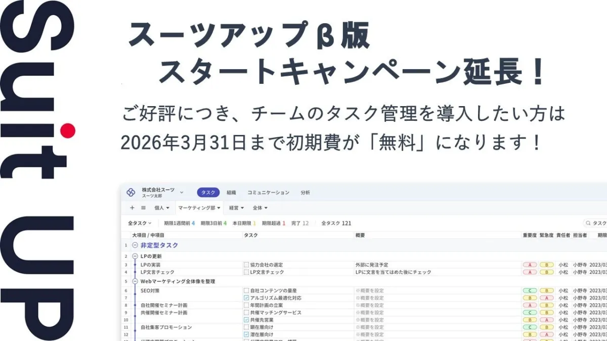 株式会社スーツが提供するタスク管理・プロジェクト管理ツール『スーツアップ』のβ版スタートキャンペーンが、2026年3月31日まで延長されることが発表されました。このキャンペーンは、チームでの業務管理を円滑にするための特別なサービスを提供し、特に中小企業やスタートアップに注目されています。