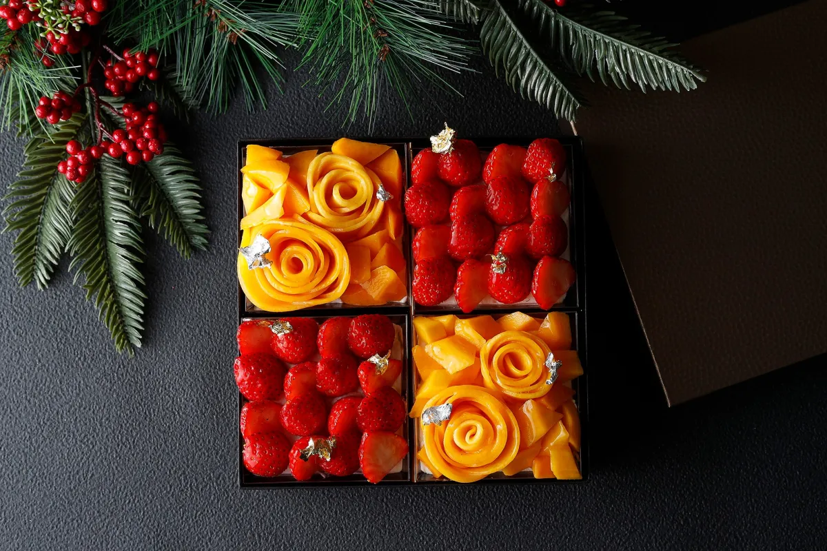 このケーキの最大の特徴は、伝統的な市松模様をモチーフにしたデザインです。使用されるフルーツは、みずみずしいいちごと甘みたっぷりのマンゴー。赤と黄色の鮮やかな配色は、まるで新年を祝うための宝石のようです。これらのフルーツは、上質なスポンジと軽いクリームの層の上に美しく配置されており、見た目だけでなく味わいでも贅沢な体験を提供します。