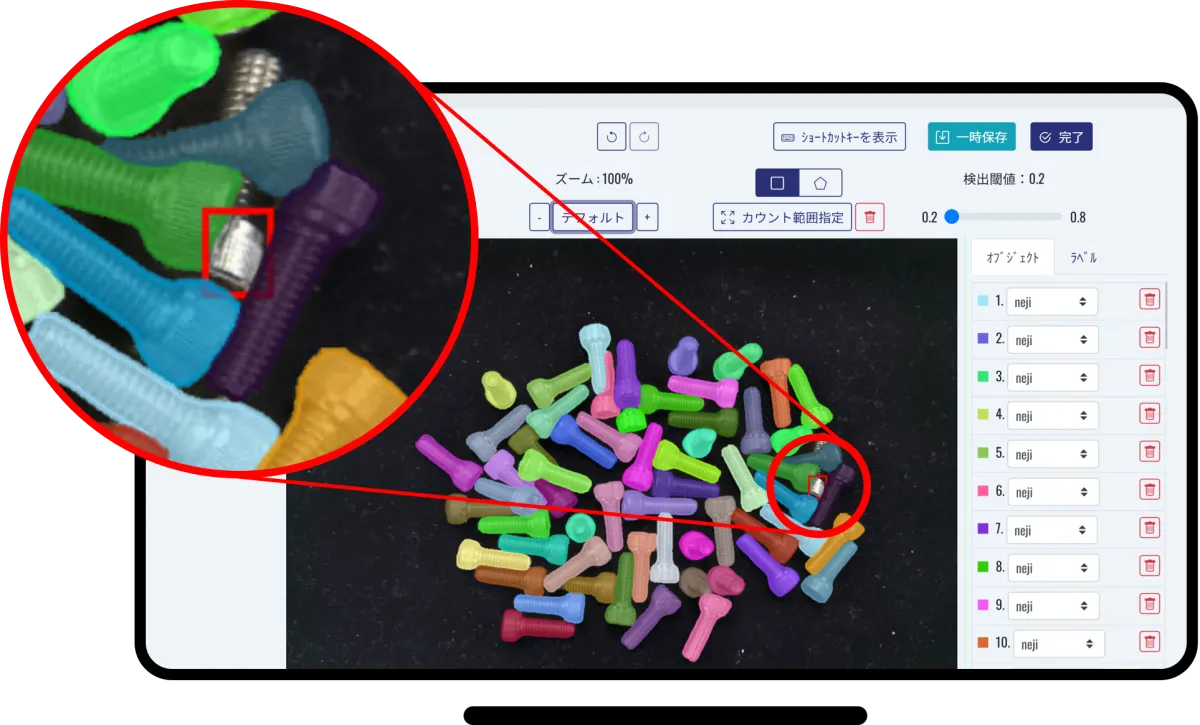 Deep Counter®は、画像上の不定形物や様々な向きに置かれた物体を、高精度かつ迅速にカウントできるAIソフトウェアです。例えば、袋に入ったネジの数を正確に数えたり、商品ごとのカウントを簡単に行ったりすることが可能です。