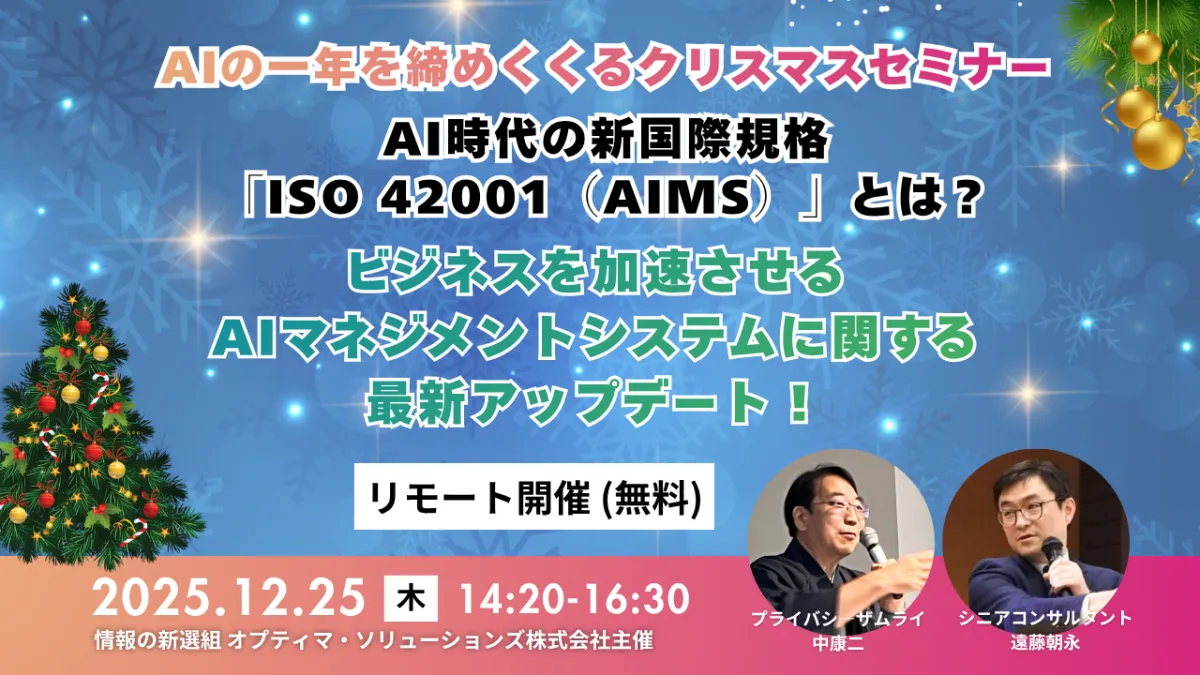 2025年12月25日に、AI(人工知能)をテーマとした特別なクリスマスセミナーが開催されます。このセミナーはオプティマ・ソリューションズ株式会社が主催し、国際規格であるISO 42001(AIMS=AIマネジメントシステム認証)について学び、ビジネスへの活用法を探る機会です。時間は14時20分から16時30分まで、参加は完全無料でリモートにて行われます。