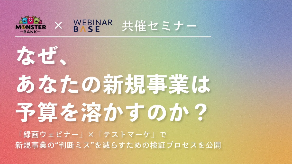 新規事業の創出において、経営者が直面する課題の一つは、施策が本当に効果を上げているのかどうかの判断です。特に、予算を消耗することに対する恐れや、施策の継続可否の判断は、結局のところデータや情報不足から来る悩みです。この問題を解決する手段として、エックスラボとモンスターバンクが共同で開催するウェビナーでは、録画ウェビナーを用いた新たなアプローチを紹介します。