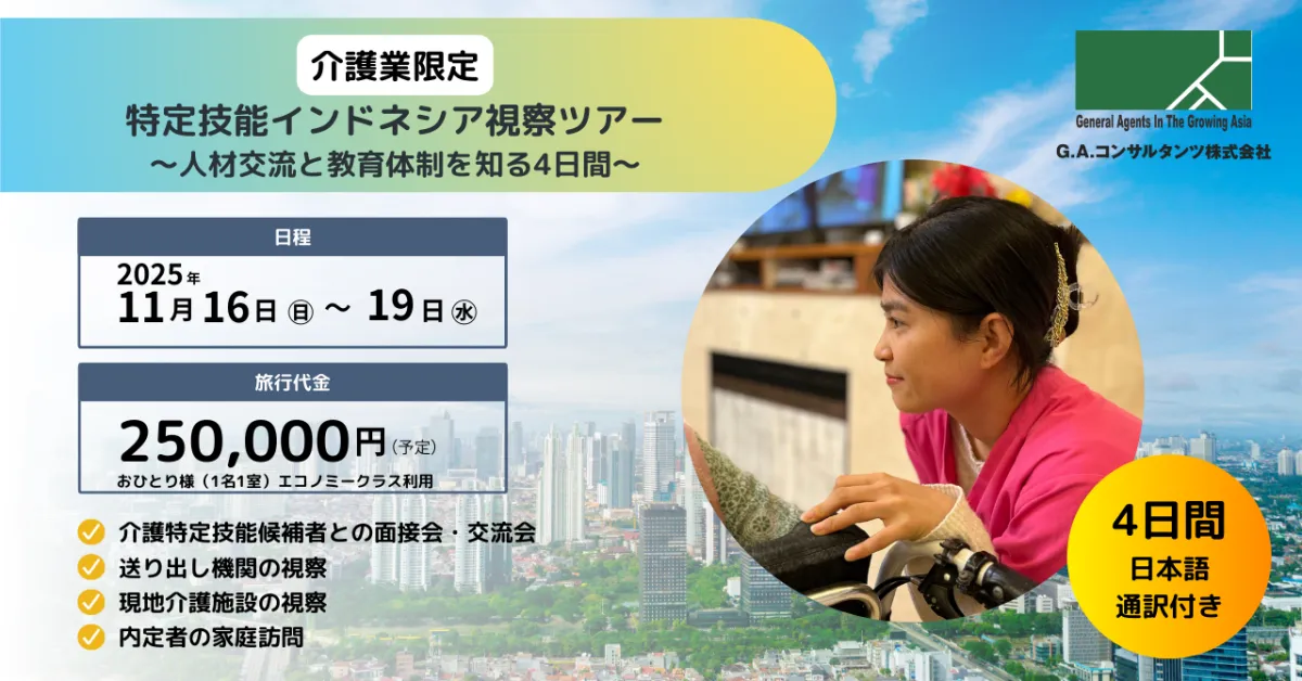 G.A.コンサルタンツ株式会社が2025年11月、介護業界を対象とした特定技能視察ツアーを開催します。このツアーは、インドネシアのジャカルタにおいて、介護候補者との面接や教育機関の視察を行い、外国人採用の具体的イメージを掴むことを目的としています。