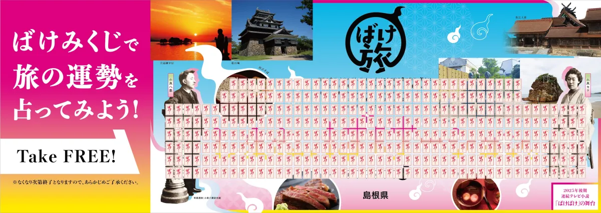 「ばけみくじ」を広げることで、旅行運勢が分かるだけでなく、「しまね、ばけーション。」のキャンペーンに参加するための二次元コードも入っています。一体どんなプレゼントが当たるのか、ワクワク感が倍増します。具体的には、島根県の宿泊補助券や買い物券などが抽選で当たるチャンスがあります。また、小泉八雲夫妻のプロフィールや、彼らの足跡をたどる情報も盛り込まれており、島根の歴史を感じることができます。