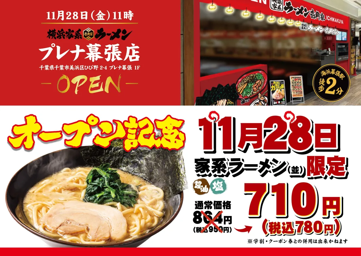 オープンを記念して、2025年11月28日(金)には「ラーメン並(醤油/塩)」が特別価格710円(税込780円)で提供されます。この機会にぜひ立ち寄り、壱角家自慢のラーメンを味わってください。