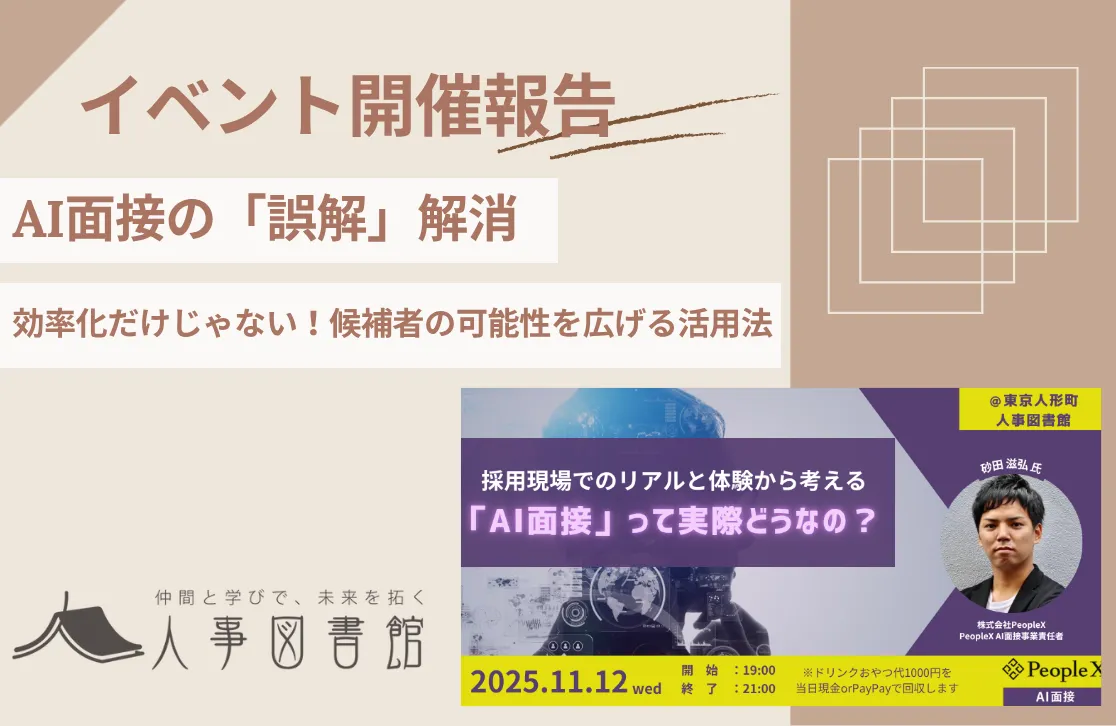 2025年11月12日、東京都中央区にある人事関連のコミュニティ「人事図書館」で、AI面接に関する勉強会が開催されました。主催の株式会社Trustyyleにより、「AI面接って実際どうなの?──採用現場でのリアルと体験から考える」というテーマのもと、株式会社PeopleXの砂田滋弘氏が登壇しました。
