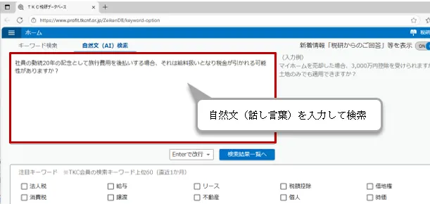 この度追加された自然文検索機能は、税理士や公認会計士が専門用語や難しいキーワードを入力しなくても、普段使う言葉で気軽に質問を入力するだけで、関連する税務Q&Aを迅速に検索・表示できるという便利な機能です。この機能により、経験の浅い職員でも簡単に税務情報を活用できる環境が整っており、特に新人教育において大きな助けとなるでしょう。