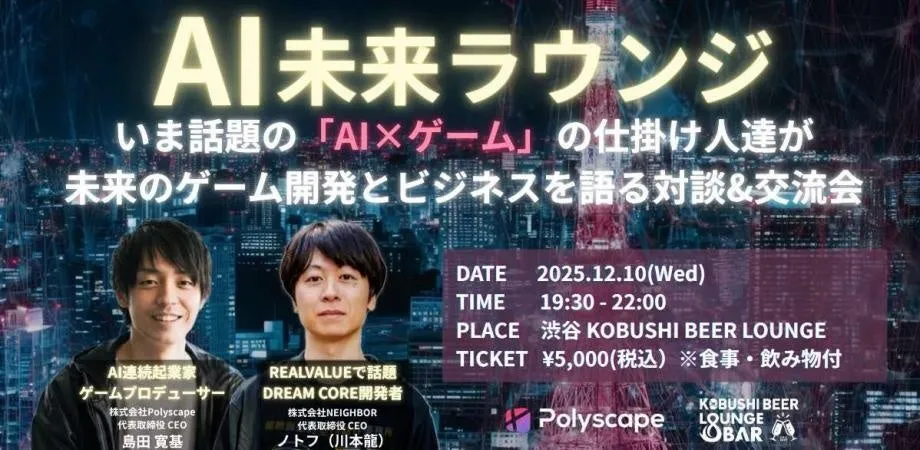 年末が近づく中、渋谷で特別なイベントが開催されます。2025年12月10日(水)、KOBUSHI MARKETING合同会社が運営する「KOBUSHI BEER LOUNGE & BAR」にて、AIとゲームの融合に関する特別対談&交流会が行われます。このイベントでは、AI活用の最前線を行く二人の起業家、Polyscape代表の島田寛基氏とNEIGHBOR代表の川本龍氏を迎え、未来のゲーム開発やビジネスモデルについての対談が行われます。