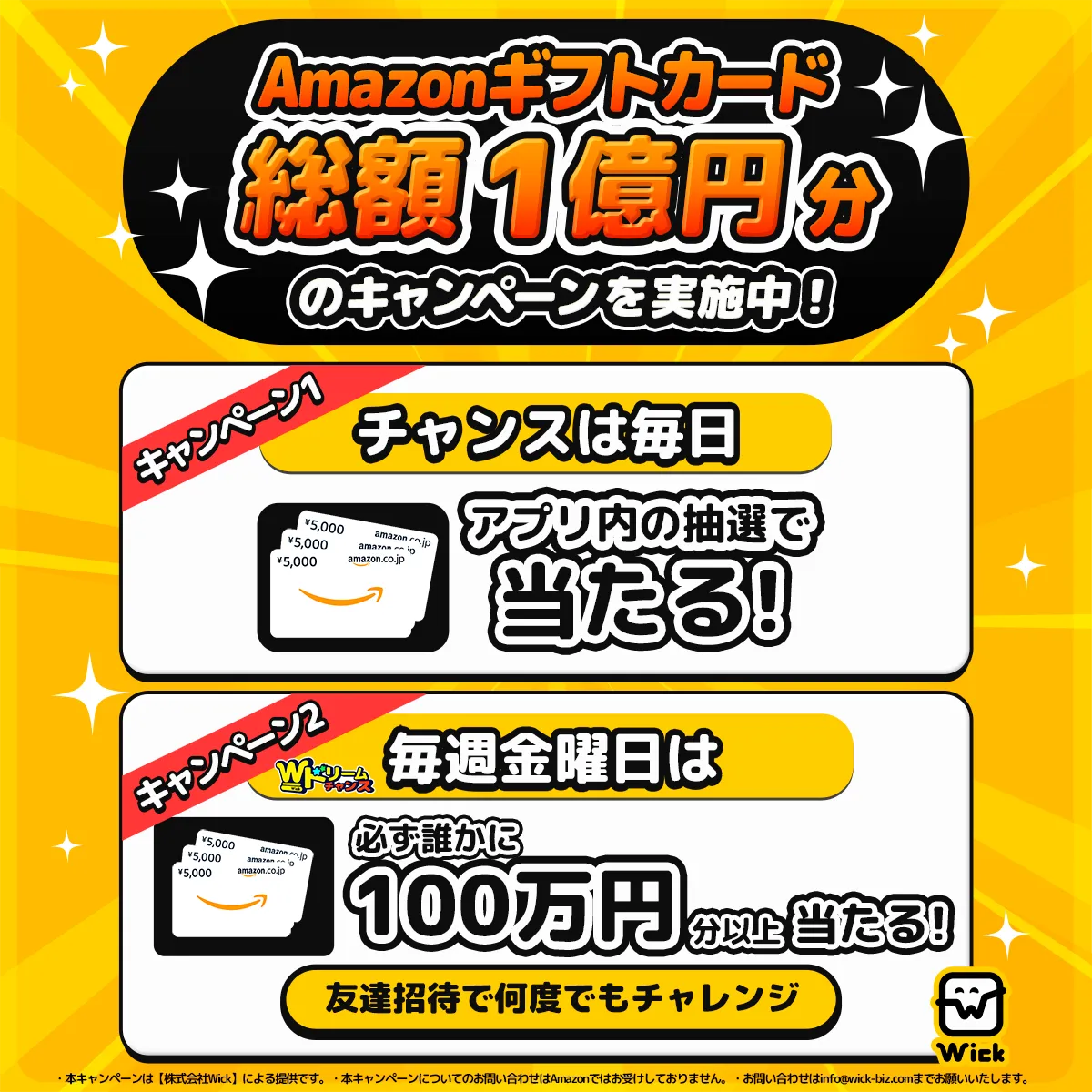 2025年7月25日、漫画を実質無料で楽しめるアプリ「Wick」がリリースされることを記念して、株式会社Wickが開催する「Wickドリームチャンス」が注目を集めています。特に、参加ユーザー数に応じて当選額が増えていくという、毎週金曜日に行われるBIGチャンスイベントで、なんと総額1億円のAmazonギフトカードが当たるという嬉しいNEWSが飛び込んできました。