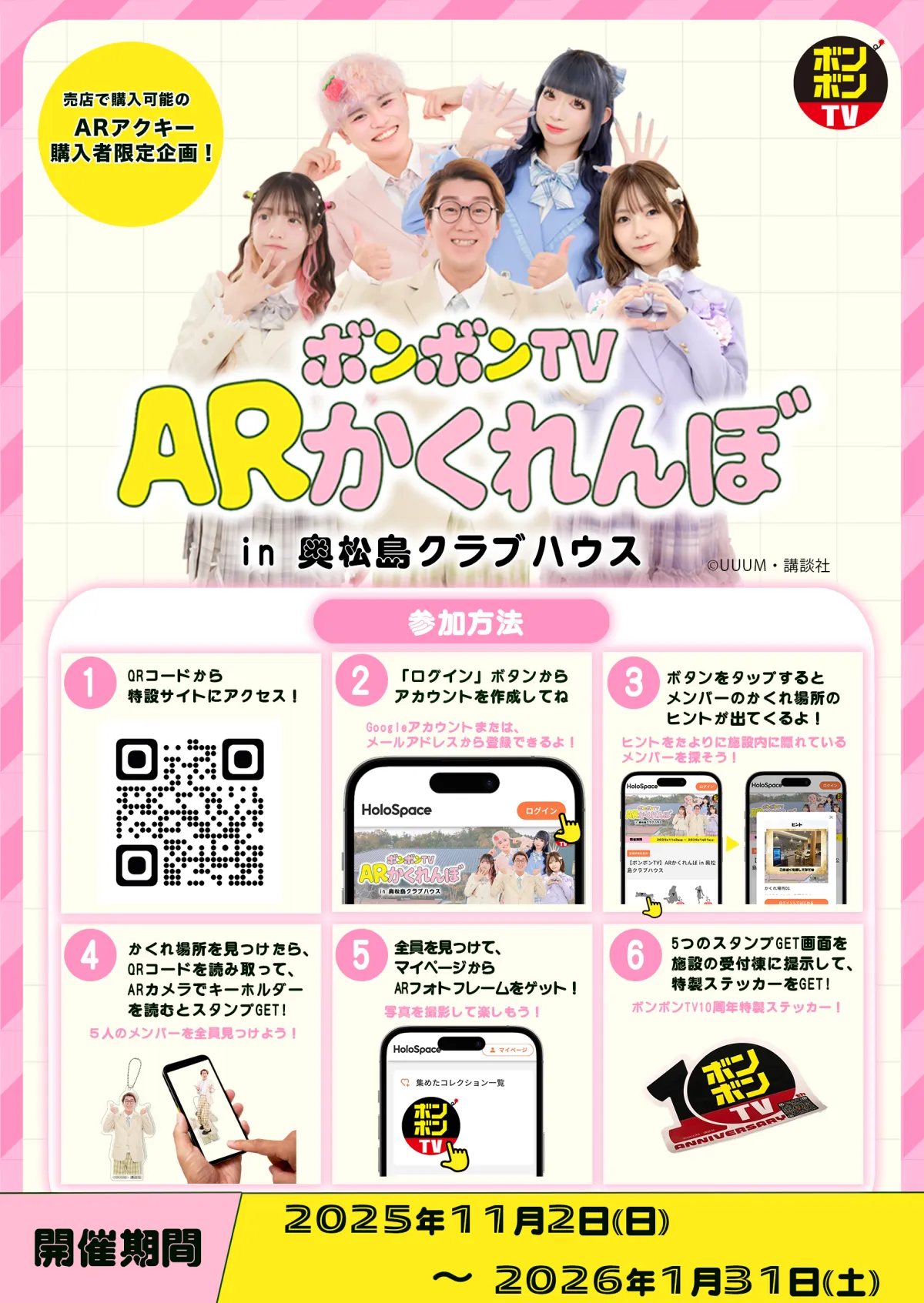 株式会社HoloSpaceが主催する「ボンボンTV ARかくれんぼ」は、人気YouTubeチャンネル「ボンボンTV」と宮城県の観光施設「奥松島クラブハウス」がタッグを組んだ新たなエンターテインメントイベントです。このコラボレーションは、2025年11月2日から2026年1月31日までの期間限定で実施され、参加者がAR体験を通じて楽しめる内容となっています。