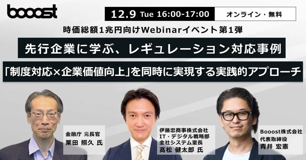サステナビリティが企業にとって重要なテーマとなっている今、Booost株式会社は、2025年12月9日の16時から、オンラインでのセミナーを開催します。本セミナーは、企業のレギュレーション対応と企業価値の向上を同時に実現するための実践的なアプローチを学ぶためのものです。日本の大手企業での成功事例を知る絶好の機会です。