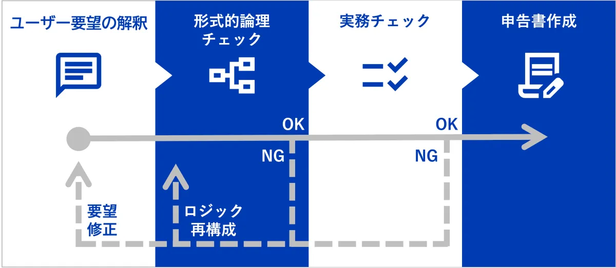 生成AIは、数学的なルールに則って正確な出力を生成する必要があります。具体的には、税法や適用手順の形式的整合性を確認することで、AIが出す情報が法律に即しているかどうかを事前に検証します。タクマネは定理証明ツールを用いて、このチェックを行います。
