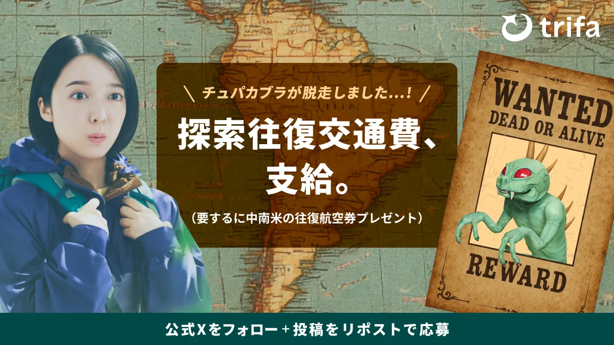 トリファが送り出すこのキャンペーン、正式名称は「中南米往復航空券が当たるチュパカブラ探索キャンペーン」です。興味がある方は、公式Xアカウントをフォローして、キャンペーン投稿をリポストするだけで応募完了です。チュパカブラの故郷、メキシコシティやリオデジャネイロ、ブエノスアイレス、リマのいずれかへの航空券が当たる可能性があります。