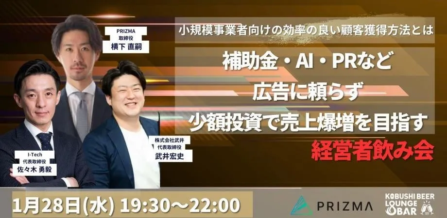 2026年1月28日、水曜日の夜に渋谷道玄坂にて「少額投資で売上爆増を目指す経営者飲み会」が開催されます。主催は、I-Techの佐々木代表、PRIZMAの横下取締役、そして武井代表が務めるこのイベントは、広告費の高騰に悩む多くの中小企業や個人事業主に対し、新たな顧客獲得の方法を探り、ビジネスチャンスを創出する場となります。