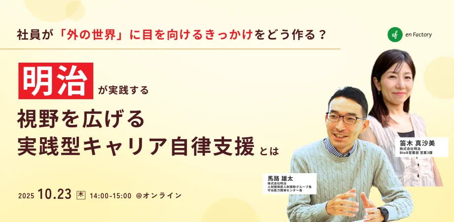 2025年10月23日(木)14:00から15:00にかけて、『社員が「外の世界」に目を向けるきっかけをどう作る?明治が実践する“視野を広げる”実践型キャリア自律支援とは』というテーマで、オンラインウェビナーを開催します。参加は無料、さらにお申込みの皆様には、2週間限定でアーカイブ配信が行われるので、日程が合わない方も気軽にご参加いただけます。