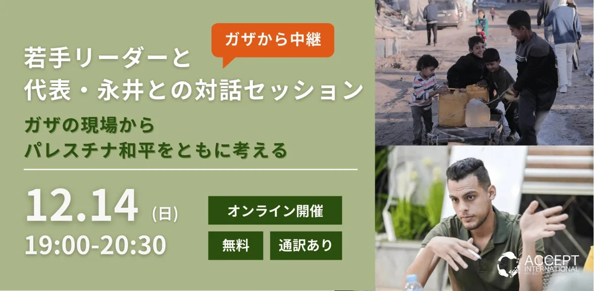 2025年12月14日(日)、NPO法人アクセプト・インターナショナルが主催するオンライン対話セッションが開催されます。このイベントは、パレスチナの若手リーダーたちの直の声を国際社会に届けることを目的としています。主な登壇者として、パレスチナから2名の若者と同団体の代表理事である永井陽右氏が参加します。