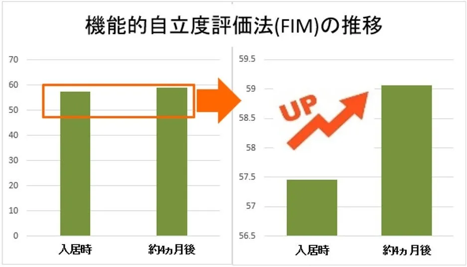 本研究は、2024年の春に、新たに入居した67名の要介護高齢者を対象に実施されました。入居前と入居後4ヶ月のFIMスコアを比較したところ、平均スコアが57.46点から59.07点へと向上しました。特に、排泄や移乗、歩行などの生活動作において顕著な改善が認められています。これは、入居者が自分の力を引き出し、日々の生活の中で「できること」を増やしていくことに繋がっています。