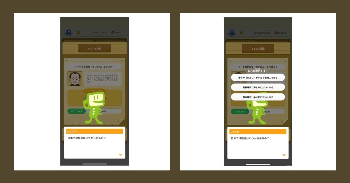 「税金クイズ」はPochettePlusアプリのクエスト形式で出題され、子どもたちは自分のレベルに合わせた難易度の問題に挑戦します。以下はクイズの一例です: