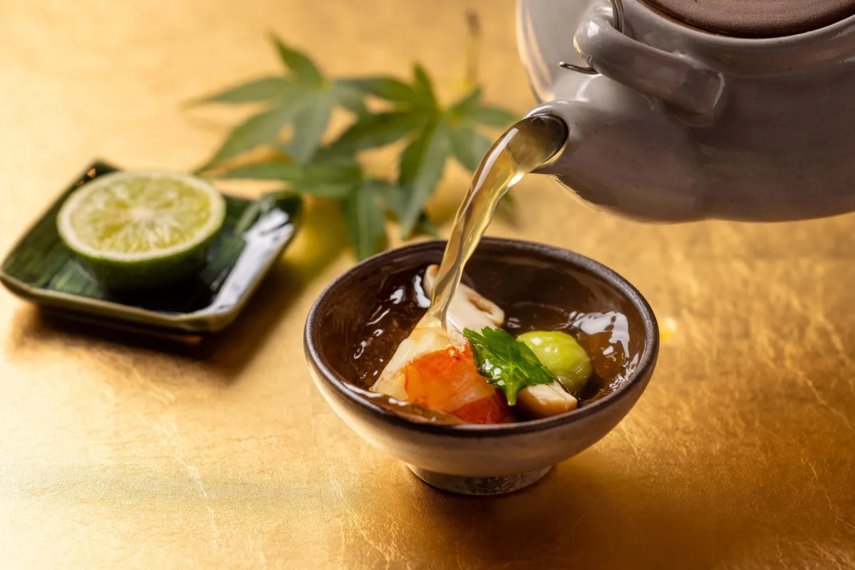 この季節、鉄板 天祐では、旬の食材を使った特別コースが登場します。「秋の松茸コース」では、香り高い松茸のほか、旨み豊かな車海老と共に提供される土瓶蒸しが名物です。シェフがその場で車海老を調理し、香ばしさを引き立てることで、出汁の風味が引き立てられます。