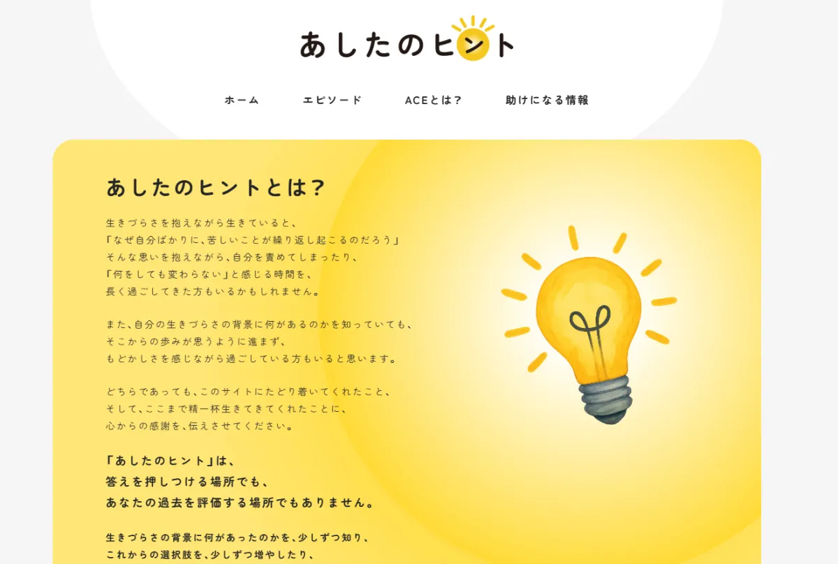 『あしたのヒント』は、ACEサバイバーが、自らの生きづらさを理解し、選択肢を広げるための手がかりを得る目的で設立されました。サイト自体は現在進行形で成長するものであり、体験談、支援情報、ACEスコアの判定など、多くのコンテンツを基に構成されています。