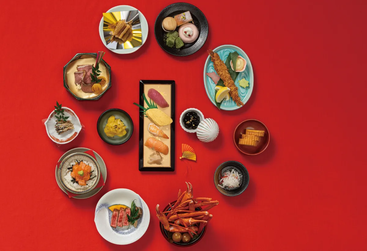 このビュッフェは、7つの特別なメニューとたくさんのスイーツが用意されています。特に目を引くのが、食べ放題で楽しめる蟹の氷台盛り。他にも、寿司、牛サーロインの鉄板焼き、ローストビーフなど、贅沢な食材を惜しみなく使用した料理が並びます。旬の食材を使った銀鱈や鴨料理も用意されており、新年ならではの華やかな彩りが楽しめる一品です。