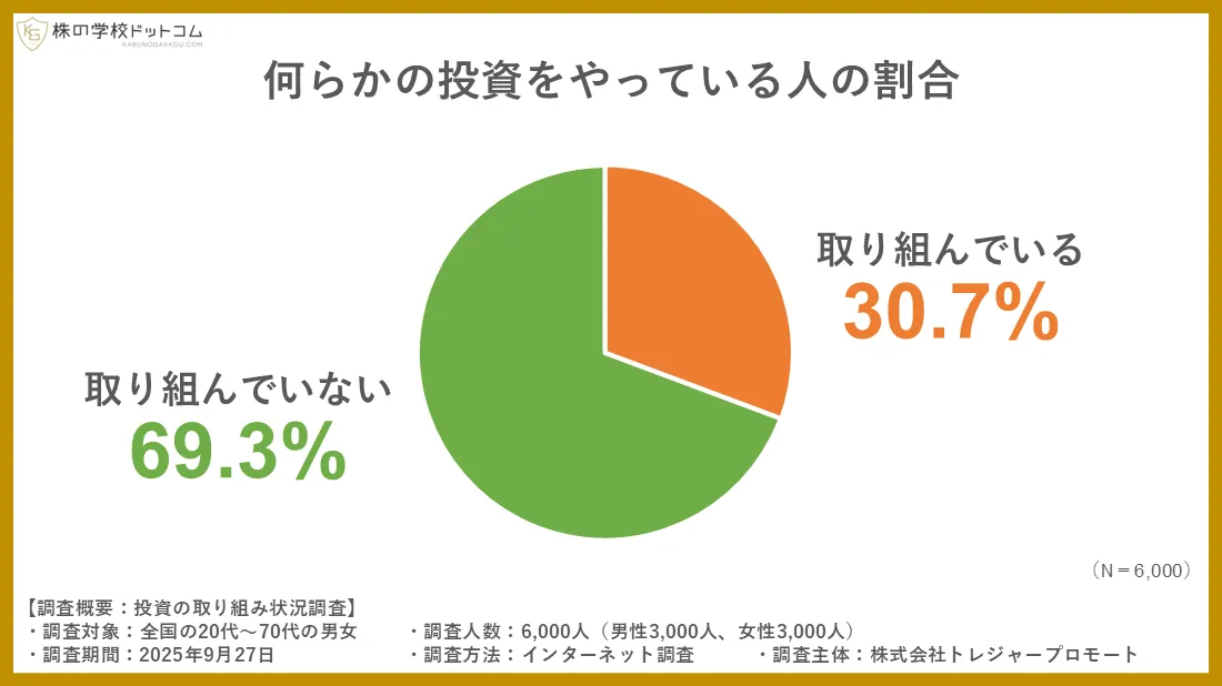 10月4日は「投資の日」。この日に合わせて、オンライン株式スクール「株の学校ドットコム」が実施した全国調査の結果が報告されました。調査対象は20代から70代の男女6000人。投資活動に取り組んでいる人は全体で31%という結果が示され、その中でも女性の参加率はまだまだ低いことが浮き彫りになりました。