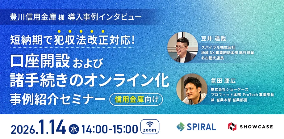 2026年1月14日(水)、豊川信用金庫の事例を基にした「口座開設及び諸手続きオンライン化事例紹介セミナー」が開催されます。このセミナーは、株式会社ショーケースとスパイラル株式会社の共同で行われ、デジタル化の最前線を学ぶ絶好の機会です。