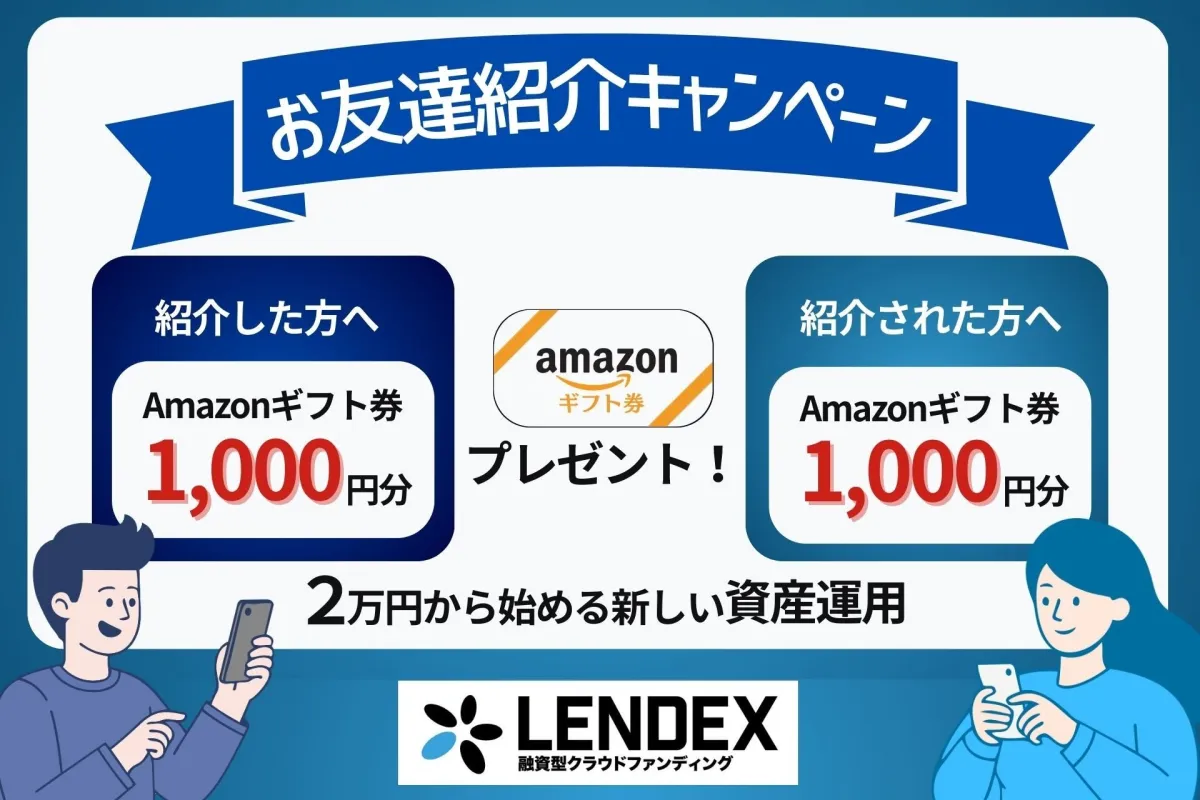 友達を紹介するだけで、両者にAmazonギフト券がもらえるこの絶好のチャンスをお見逃しなく。少額から高利回りの投資が可能なレンデックスで、新しい投資体験を始めましょう!詳細や参加方法については、